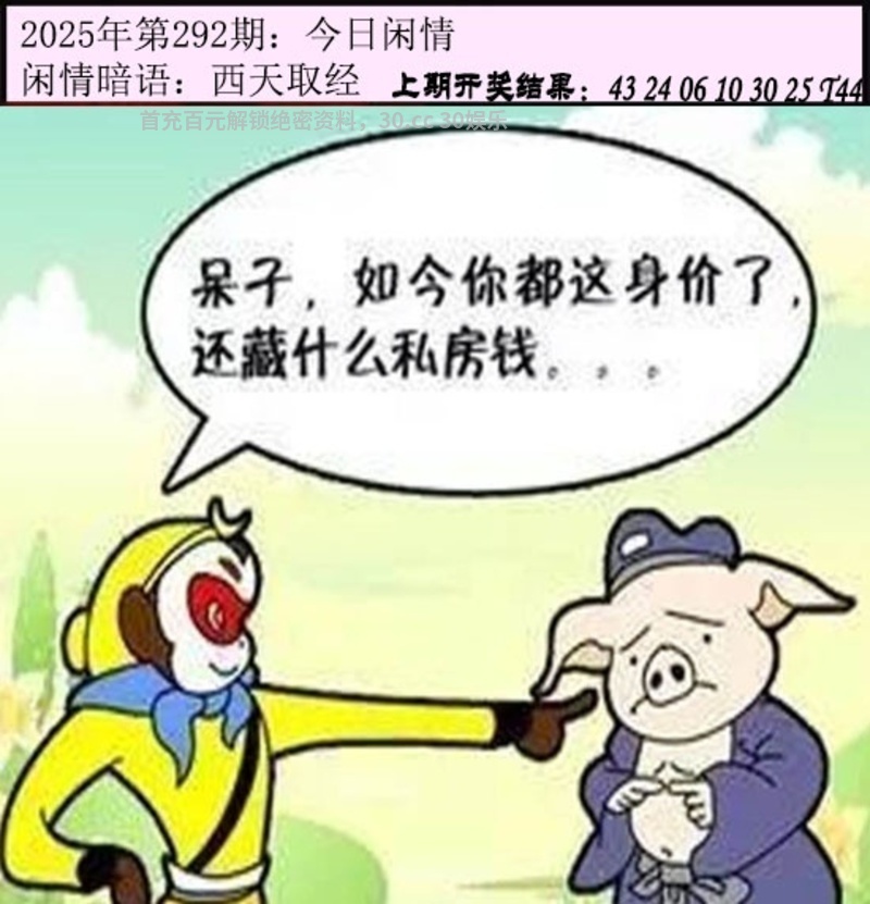 292期:今日闲情暗语:西天取经 解释:指古典名著《西游记》中唐僧师徒西天取经遭受的磨难。解虎猪猴龙马牛 综合取肖:虎猪猴龙马牛 |